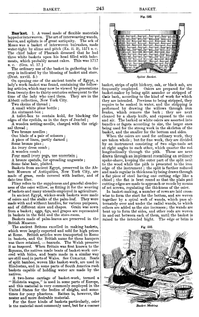 Basket, ---. Knight's American Mechanical Dictionary, 1876, 2 pages. Posted August 13, 2003. SAMPLE PAGE. File size 556 KB PDF