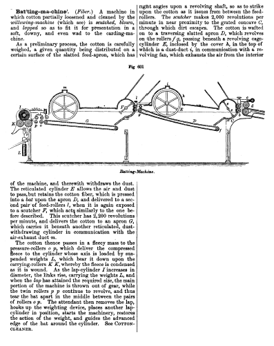 Cotton Machinery, ---. Knight's American Mechanical Dictionary, 1876, 1 page. Posted September 5, 2003. SAMPLE PAGE. File size 460 KB PDF