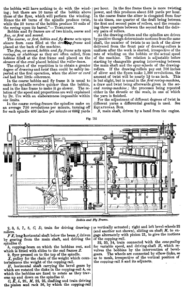 Bobbin and Fly Frame, ---. Knight's American Mechanical Dictionary, 1876, 2 pages. Posted August 13, 2003. SAMPLE PAGE. File size 596 KB PDF
