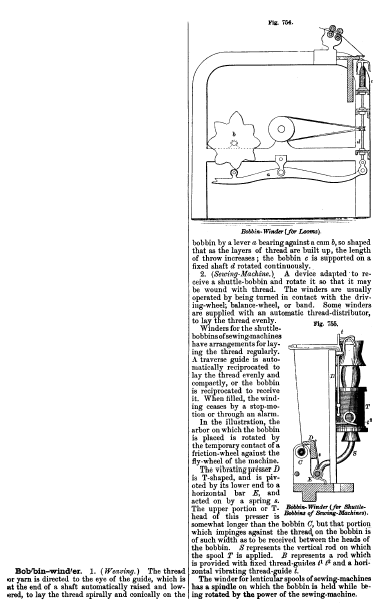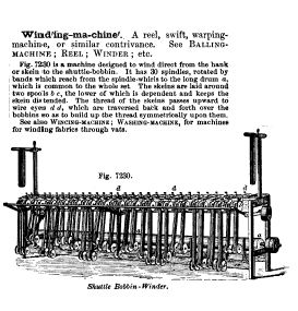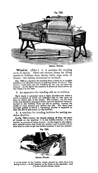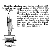 Bobbin-Winder, ---. Knight's American Mechanical Dictionary, 1876, 1 page. Posted August 14, 2003. SAMPLE PAGE. File size 464 KB PDF