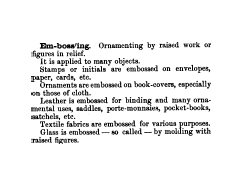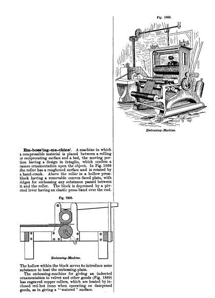 Embossing, ---. Knight's American Mechanical Dictionary, 1884, 1 page. Posted February 16, 2005. SAMPLE PAGE. File size 400 KB PDF