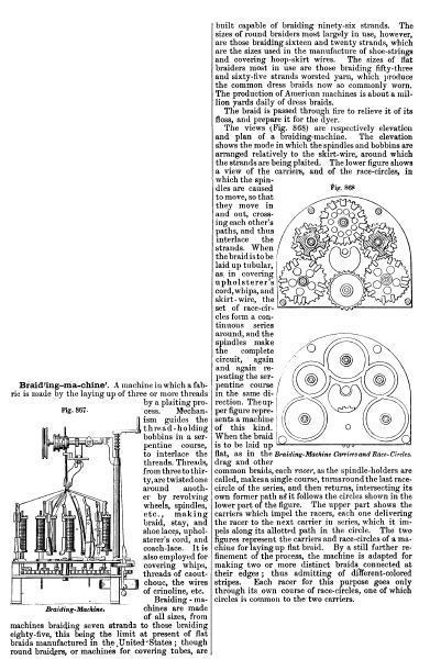 Braiding-Machine, ---. Knight's American Mechanical Dictionary, 1876, 1 page. Posted August 14, 2003. SAMPLE PAGE. File size 476 KB PDF