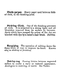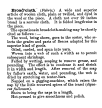 Broadcloth, ---. Knight's American Mechanical Dictionary, 1876, 1 page. Posted May 11, 2004. SAMPLE PAGE. File size 408 KB PDF