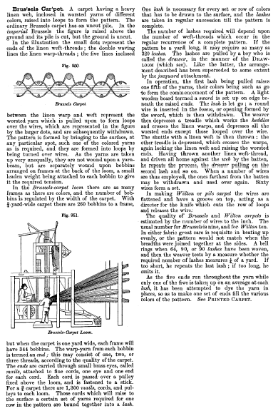 Brussels Carpet, ---. Knight's American Mechanical Dictionary, 1876, 2 pages. Posted August 21, 2003. SAMPLE PAGE. File size 504 KB PDF