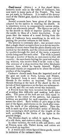 Cashmere, ---. Knight's American Mechanical Dictionary, 1876, 1 page. Posted August 21, 2003. SAMPLE PAGE. File size 444 KB PDF