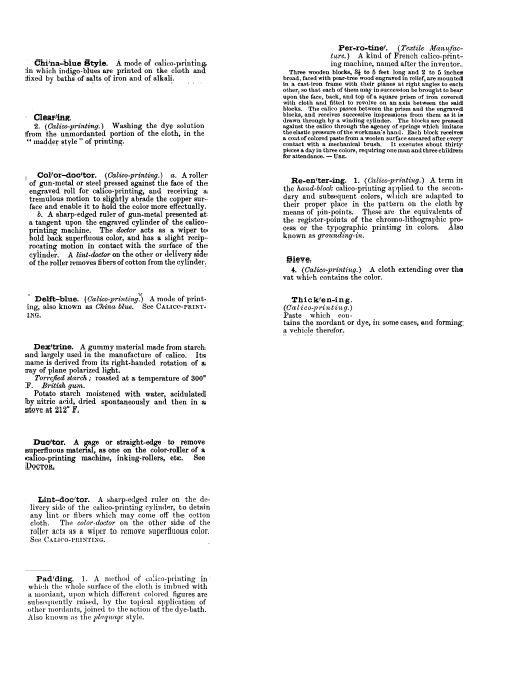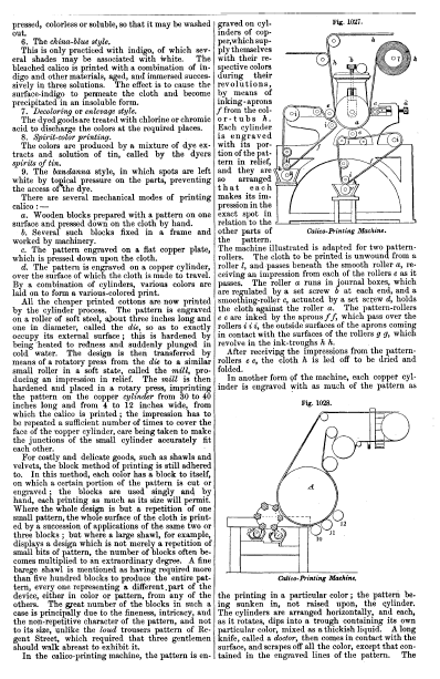 Calico Printing, ---. Knight's American Mechanical Dictionary, 1876, 4 pages. Posted August 21, 2003. SAMPLE PAGE. File size 692 KB PDF