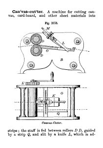 Canvas Cutter, ---. Knight's American Mechanical Dictionary, 1876, 1 page. Posted June 19, 2004. SAMPLE PAGE. File size 404 KB PDF