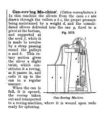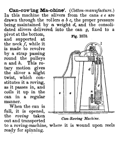 Can-Roving Machine, ---. Knight's American Mechanical Dictionary, 1876, 1 page. Posted September 3, 2003. SAMPLE PAGE. File size 412 KB PDF