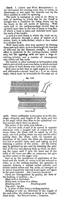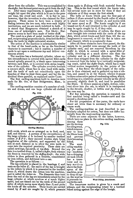 Carding-Machine, ---. Knight's American Mechanical Dictionary, 1876, 3 pages. Posted September 4, 2003. SAMPLE PAGE. File size 616 KB PDF