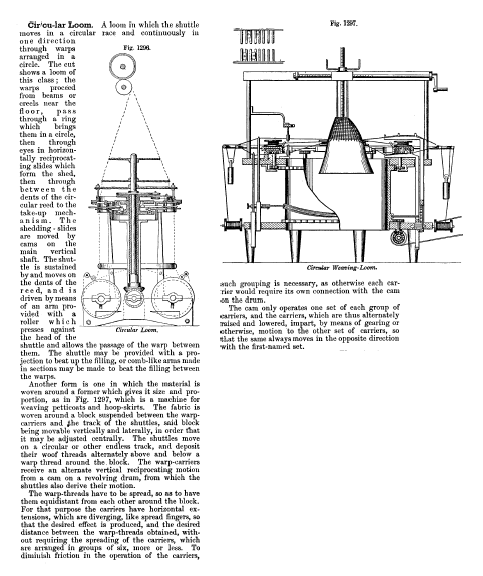 Circular Loom, ---. Knight's American Mechanical Dictionary, 1876, 1 page. Posted September 3, 2003. SAMPLE PAGE. File size 472 KB PDF