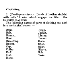Clothing, ---. Knight's American Mechanical Dictionary, 1876, 1 page. Posted May 11, 2004. SAMPLE PAGE. File size 396 KB PDF