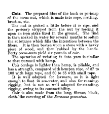 Coir, ---. Knight's American Mechanical Dictionary, 1876, 1 page. Posted May 11, 2004. SAMPLE PAGE. File size 408 KB PDF
