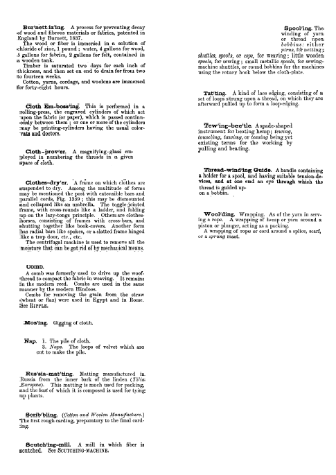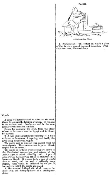 Combing, ---. Knight's American Mechanical Dictionary, 1876, 1 page. Posted May 11, 2004. SAMPLE PAGE. File size 408 KB PDF