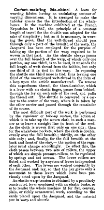 Corset-Making Machine, ---. Knight's American Mechanical Dictionary, 1876, 1 page. Posted May 7, 2004. SAMPLE PAGE. File size 436 KB PDF