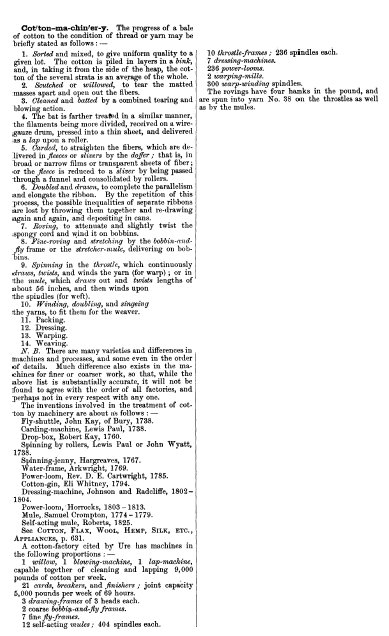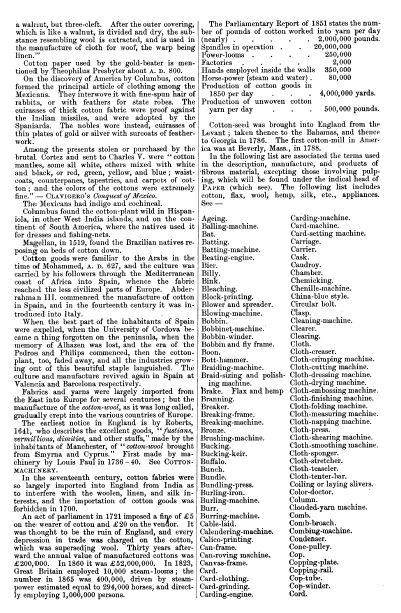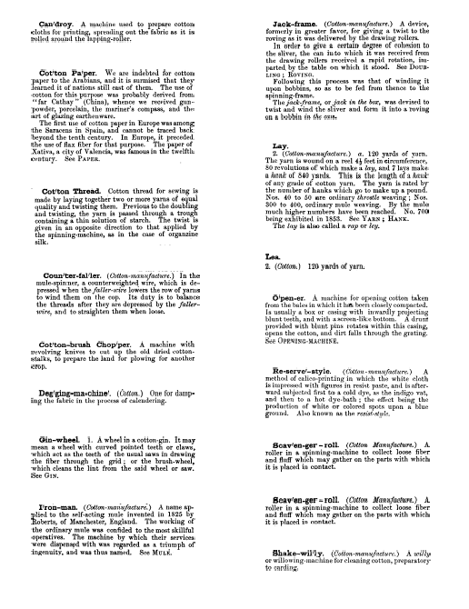 Cotton, ---. Knight's American Mechanical Dictionary, 1876, 4 pages. Posted September 5, 2003. SAMPLE PAGE. File size 656 KB PDF