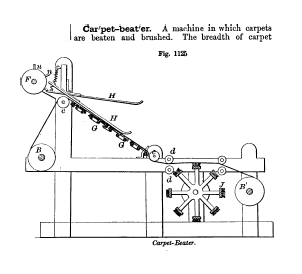 Carpet Beater, ---. Knight's American Mechanical Dictionary, 1876, 1 page. Posted September 5, 2003. SAMPLE PAGE. File size 400 KB PDF