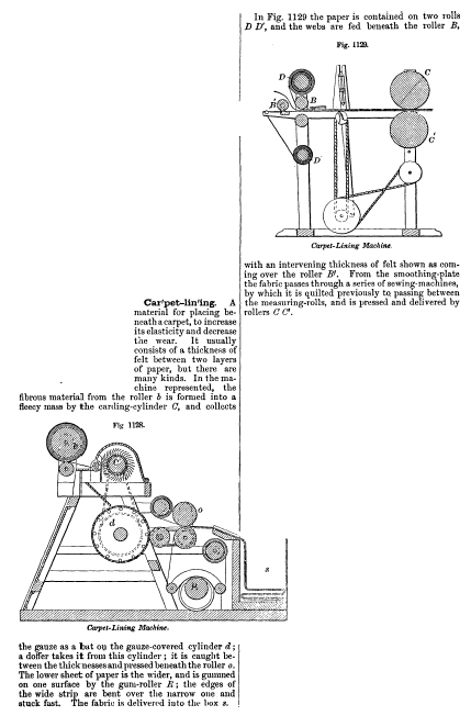 Carpet-Lining, ---. Knight's American Mechanical Dictionary, 1876, 1 page. Posted September 4, 2003. SAMPLE PAGE. File size 444 KB PDF