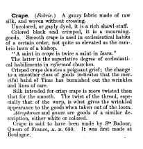 Crape, ---. Knight's American Mechanical Dictionary, 1876, 1 page. Posted May 7, 2004. SAMPLE PAGE. File size 412 KB PDF