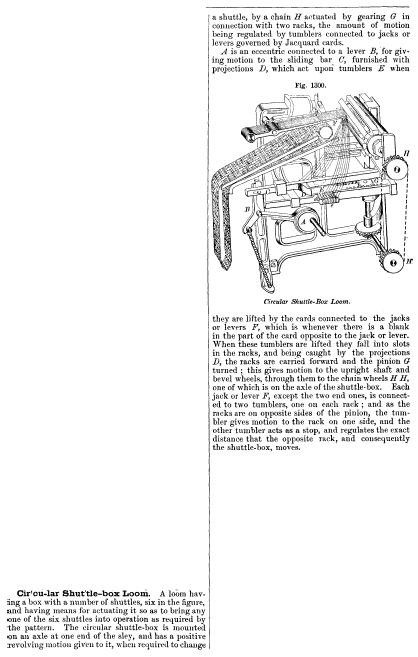 Circular Shuttle-Box Loom, ---. Knight's American Mechanical Dictionary, 1876, 1 page. Posted September 4, 2003. SAMPLE PAGE. File size 452 KB PDF