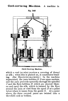 Cord-Covering Machine, ---. Knight's American Mechanical Dictionary, 1876, 1 page. Posted May 7, 2004. SAMPLE PAGE. File size 412 KB PDF