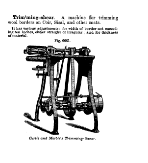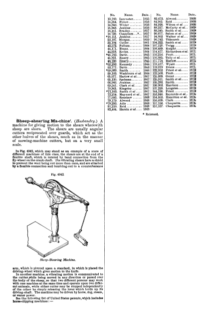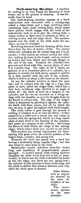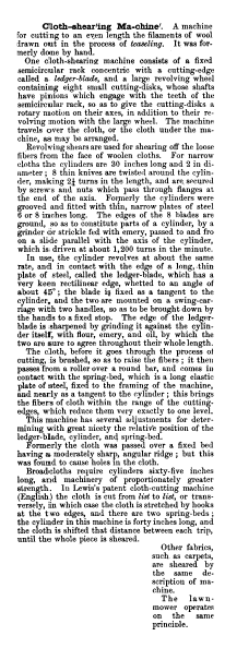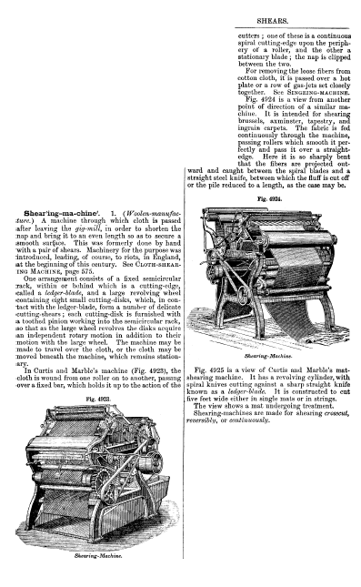 Cloth-Shearing Machine, ---. Knight's American Mechanical Dictionary, 1876, 1 page. Posted September 5, 2003. SAMPLE PAGE. File size 456 KB PDF