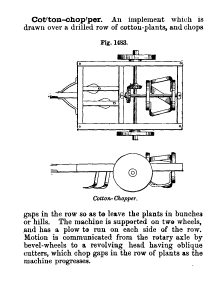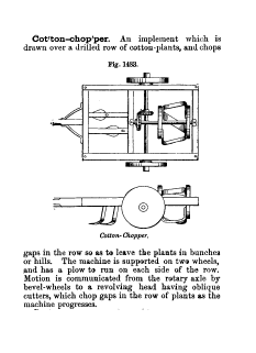Cotton Chopper, ---. Knight's American Mechanical Dictionary, 1876, 1 page. Posted May 11, 2004. SAMPLE PAGE. File size 404 KB PDF