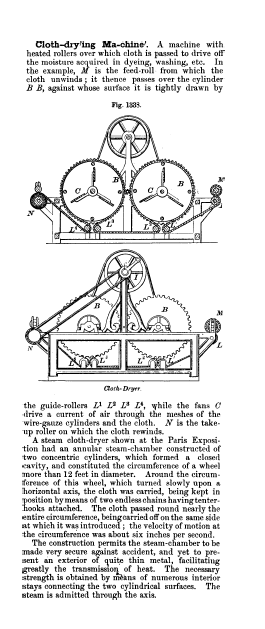 Cloth-Drying Macine, ---. Knight's American Mechanical Dictionary, 1876, 1 page. Posted September 4, 2003. SAMPLE PAGE. File size 440 KB PDF