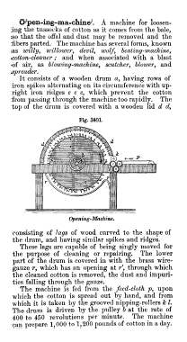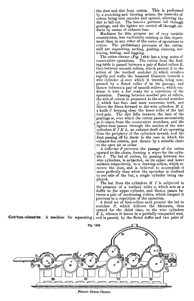 Cotton Cleaner, ---. Knight's American Mechanical Dictionary, 1876, 1 page. Posted September 5, 2003. SAMPLE PAGE. File size 492 KB PDF
