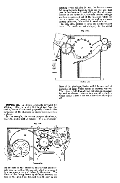 Cotton Gin, ---. Knight's American Mechanical Dictionary, 1876, 1 page. Posted September 5, 2003. SAMPLE PAGE. File size 448 KB PDF