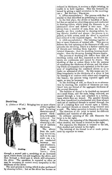 Silk Twisting and Reeling, ---. Knight's American Mechanical Dictionary, 1876, 1 page. Posted September 11, 2003. SAMPLE PAGE. File size 408 KB PDF