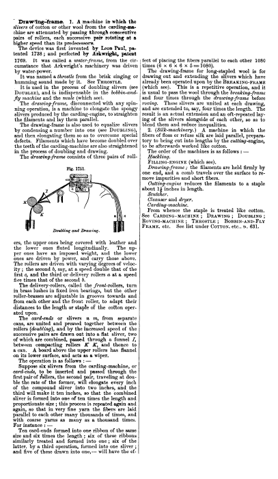 Drawing Frame, ---. Knight's American Mechanical Dictionary, 1876, 1 page. Posted May 7, 2004. SAMPLE PAGE. File size 480 KB PDF