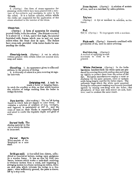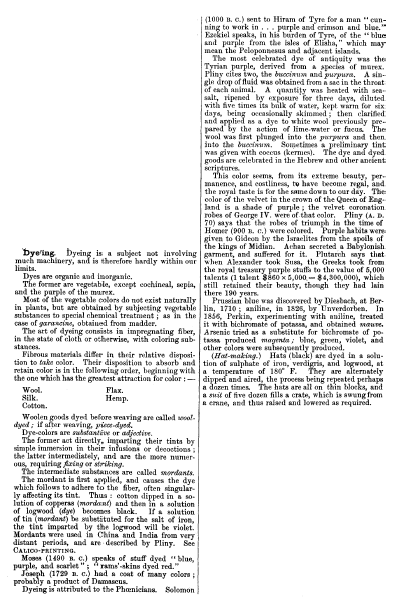 [Dyeing], ---. Knight's American Mechanical Dictionary, 1876, 1 page. Note: Collected short articles. Posted August 4, 2004. SAMPLE PAGE. File size 476 KB PDF