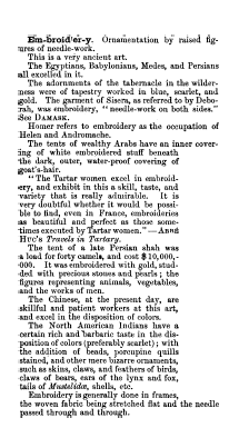 Embroidery, ---. Knight's American Mechanical Dictionary, 1876, 1 page. Posted September 7, 2003. SAMPLE PAGE. File size 424 KB PDF