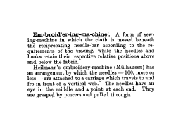 Embroidering Machine, ---. Knight's American Mechanical Dictionary, 1884, 1 page. Posted February 16, 2005. SAMPLE PAGE. File size 400 KB PDF