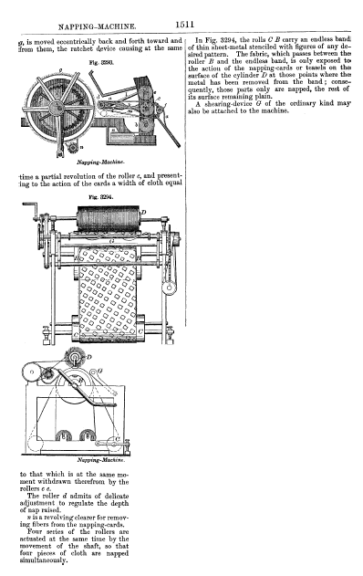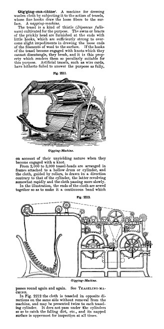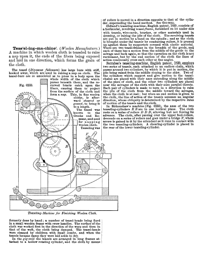 Teaseling Machine, ---. Knight's American Mechanical Dictionary, 1876, 1 page. Posted September 12, 2003. SAMPLE PAGE. File size 472 KB PDF