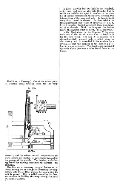 [Weaving], ---. Knight's American Mechanical Dictionary, 1876, 3 pages. Note: Collected short articles. Posted August 8, 2004. SAMPLE PAGE. File size 648 KB PDF