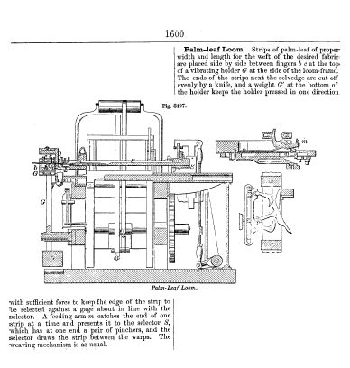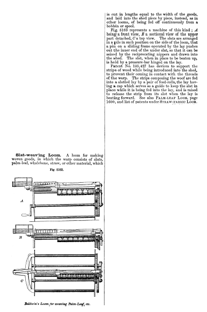 Slat-Weaving Loom, ---. Knight's American Mechanical Dictionary, 1876, 1 page. Posted September 10, 2003. SAMPLE PAGE. File size 436 KB PDF