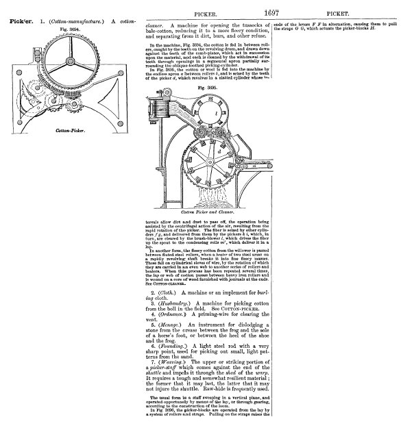 Cotton-Picker, ---. Knight's American Mechanical Dictionary, 1876, 1 page. Posted September 5, 2003. SAMPLE PAGE. File size 412 KB PDF