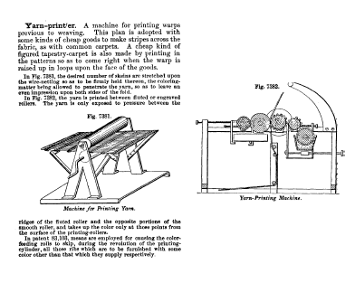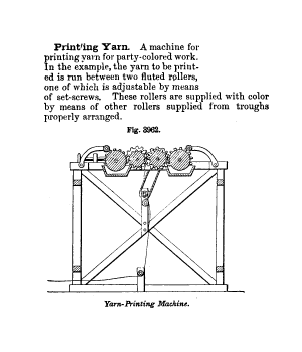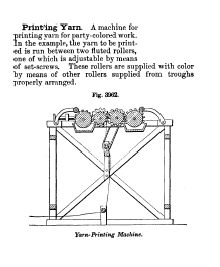 Yarn Printer, ---. Knight's American Mechanical Dictionary, 1876, 1 page. Posted September 14, 2003. SAMPLE PAGE. File size 428 KB PDF