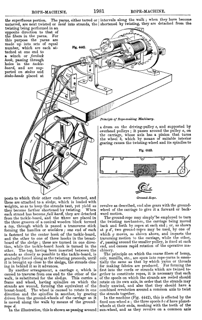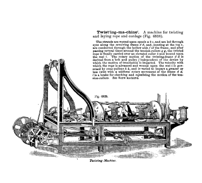 Twisting Machine, ---. Knight's American Mechanical Dictionary, 1876, 1 page. Posted September 13, 2003. SAMPLE PAGE. File size 464 KB PDF