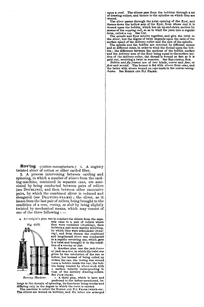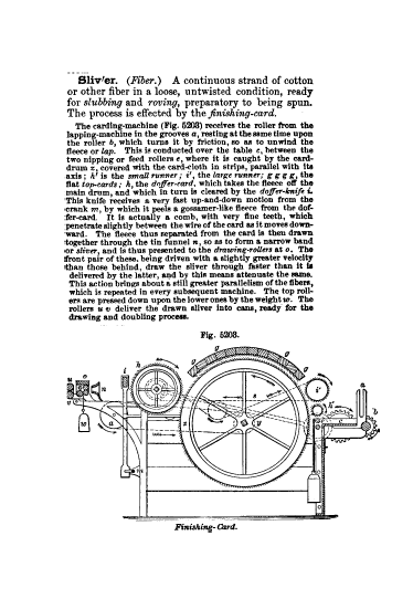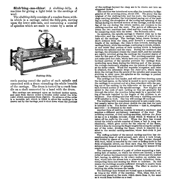 Slubbing Machine, ---. Knight's American Mechanical Dictionary, 1876, 1 page. Posted September 19, 2003. SAMPLE PAGE. File size 484 KB PDF