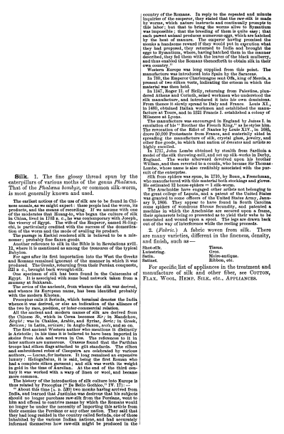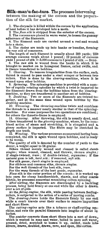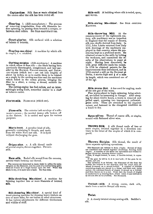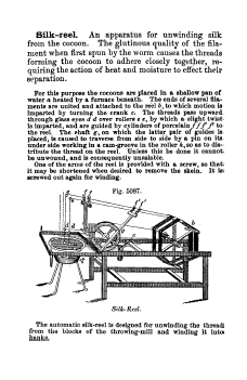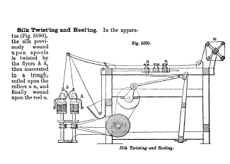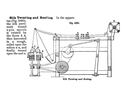 Silk Twisting and Reeling, ---. Knight's American Mechanical Dictionary, 1876, 1 page. Posted September 26, 2004. SAMPLE PAGE. File size 408 KB PDF