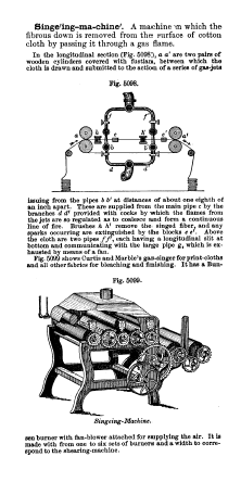 Singeing Machine, ---. Knight's American Mechanical Dictionary, 1876, 1 page. Posted September 10, 2003. SAMPLE PAGE. File size 436KB PDF