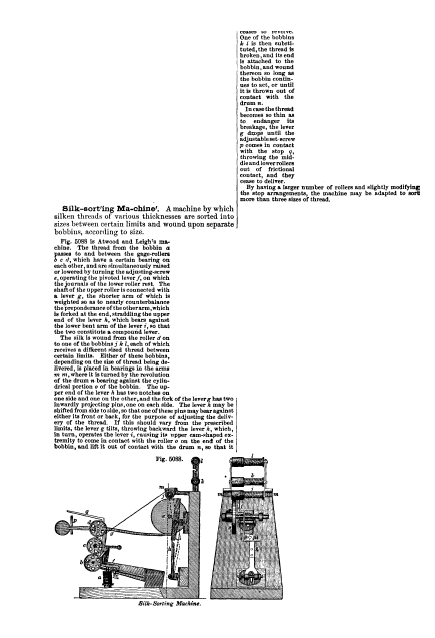 Silk-Sorting Machine, ---. Knight's American Mechanical Dictionary, 1876, 1 page. Posted September 10, 2003. SAMPLE PAGE. File size 468KB PDF