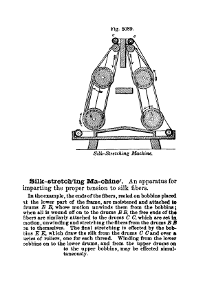 Silk-Stretching Machine, ---. Knight's American Mechanical Dictionary, 1876, 1 page. Posted September 11, 2003. SAMPLE PAGE. File size 420 KB PDF