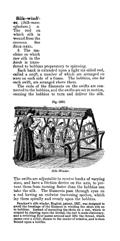 Silk Winder, ---. Knight's American Mechanical Dictionary, 1876, 1 page. Posted September 19, 2003. SAMPLE PAGE. File size 456 KB PDF