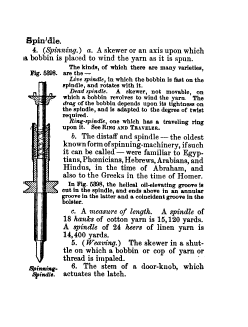 Spindle, ---. Knight's American Mechanical Dictionary, 1876, 1 page. Posted September 26, 2004. SAMPLE PAGE. File size 412 KB PDF
