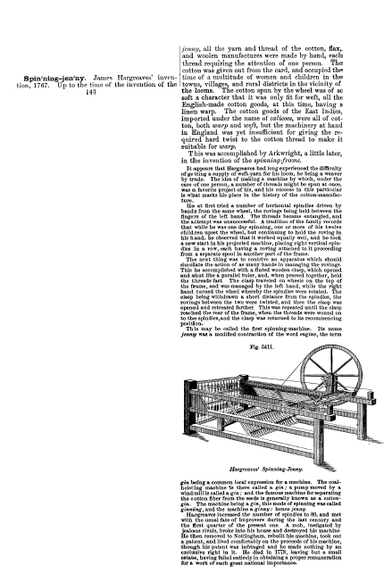 Spinning Jenny, ---. Knight's American Mechanical Dictionary, 1876, 1 page. Posted September 11, 2003. SAMPLE PAGE. File size 488 KB PDF