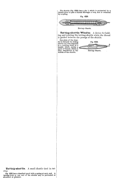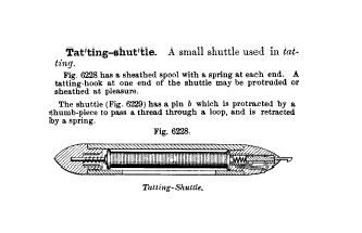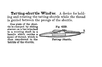 Tatting Shuttle, ---. Knight's American Mechanical Dictionary, 1876, 1 page. Posted September 26, 2004. SAMPLE PAGE. File size 400 KB PDF