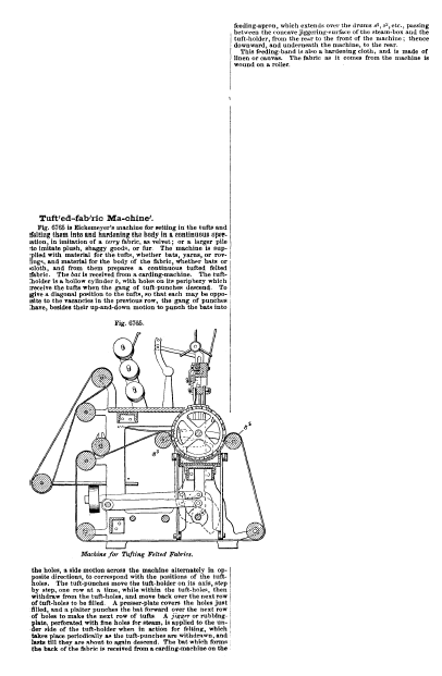 Tufted-Fabric Machine, ---. Knight's American Mechanical Dictionary, 1876, 1 page. Posted September 12, 2003. SAMPLE PAGE. File size 444 KB PDF